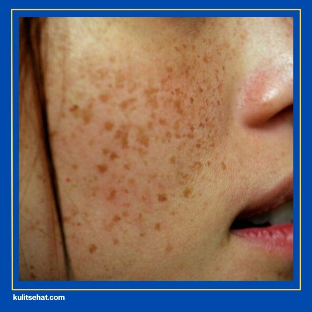 Freckles adalah bintik-bintik kecil berwarna cokelat terang yang biasanya muncul karena faktor genetik atau keturunan pada kulit wajah Kakak. Karakteristik khas dari noda ini adalah warnanya yang akan terlihat semakin jelas atau menjadi lebih banyak saat Kakak sering terpapar sinar matahari tanpa perlindungan. Bagi wanita muda, munculnya freckles terkadang dianggap sebagai pemanis, namun jika gak dirawat dengan benar, noda ini bisa menyebar ke area kulit lainnya. Pastikan Kakak selalu menjaga kelembapan kulit agar kondisi wajah tetap sehat dan bintik-bintik tersebut gak berkembang menjadi masalah pigmentasi yang lebih serius.